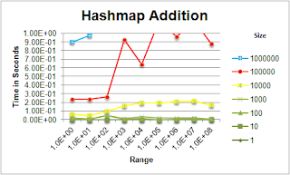 The Hashmap and the SparseArray have very comparable performance up to the 10,000 size mark. The 100,000 size mark is where some interesting results are found. For retrieving elements within a 100,000 size array, performance deteriorates quickly once the range of integers exceeds 1,000.