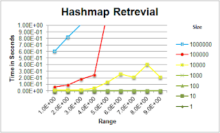 At a size of 100,000 (in red in the above graphs), the Hashmap loses performance very quickly, at the 100 range mark. However the SpraseArray is still able to retrieve elements in this range with comparable efficiency. It also breaks down after the 1,000 range limit has been hit through.