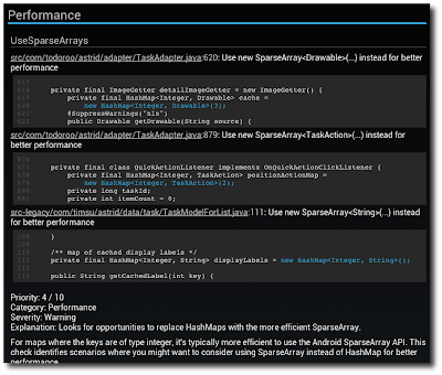 And a few other things. When I ran Lint the other day, I found one other performance tweak that was suggested by Lint. I was told that “for maps where keys are of type integer, it’s typically more efficient to use the Android SparseArray API”.